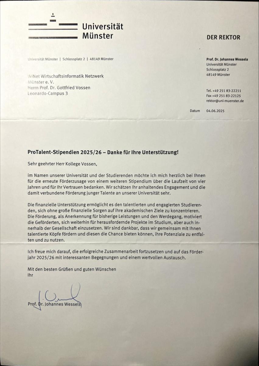 Wir freuen uns sehr, dass wir auch im Förderjahr 2025/26 wieder ein ProTalent-Stipendium an der Universität Münster unterstützen. Bei der feierlichen Vergabe durften wir die Urkunde entgegennehmen. Die finanzielle Förderung ermöglicht es talentierten Studierenden, sich auf ihre akademischen Ziele zu konzentrieren. Ein Engagement, das uns als Verein besonders am Herzen liegt.